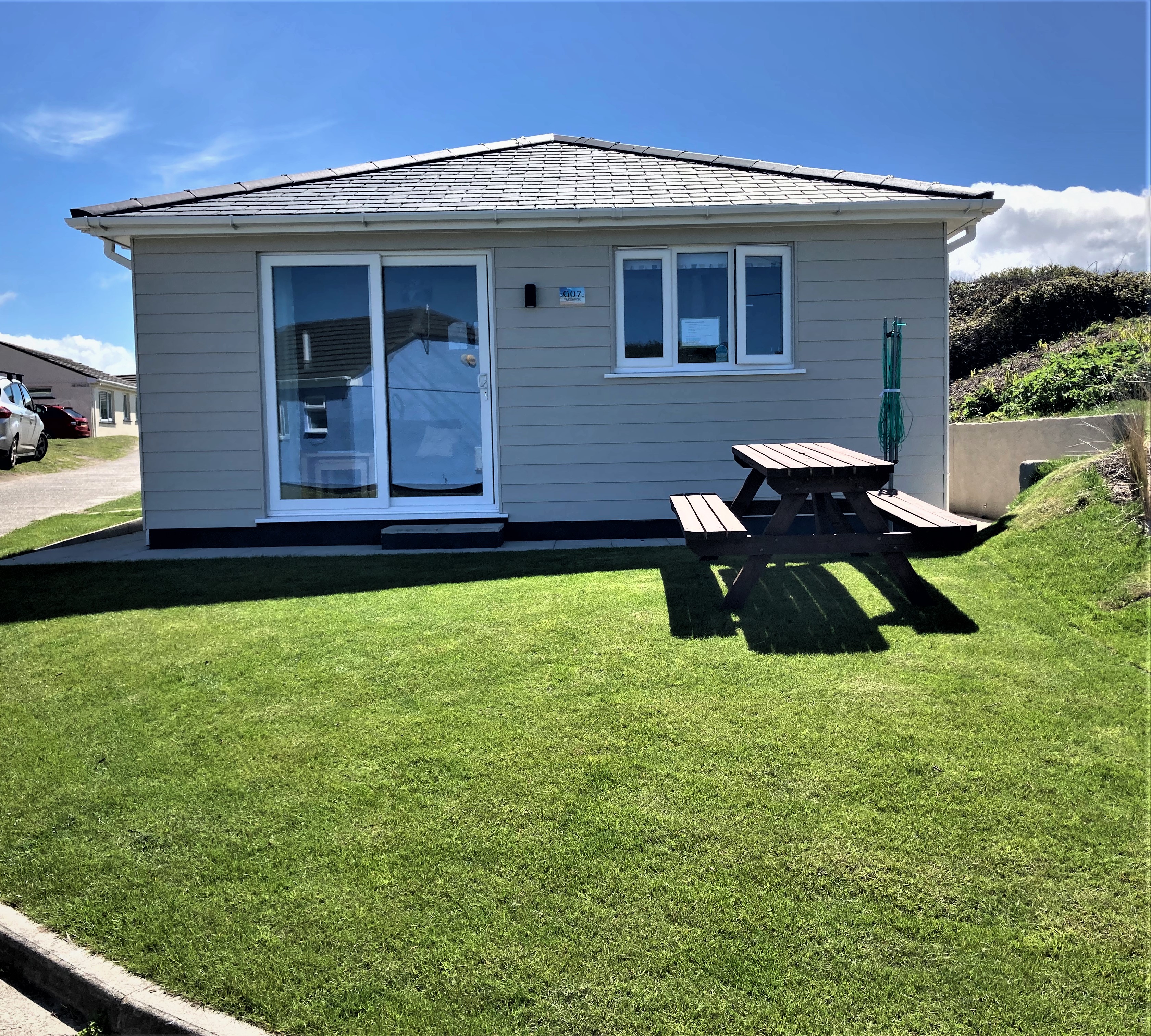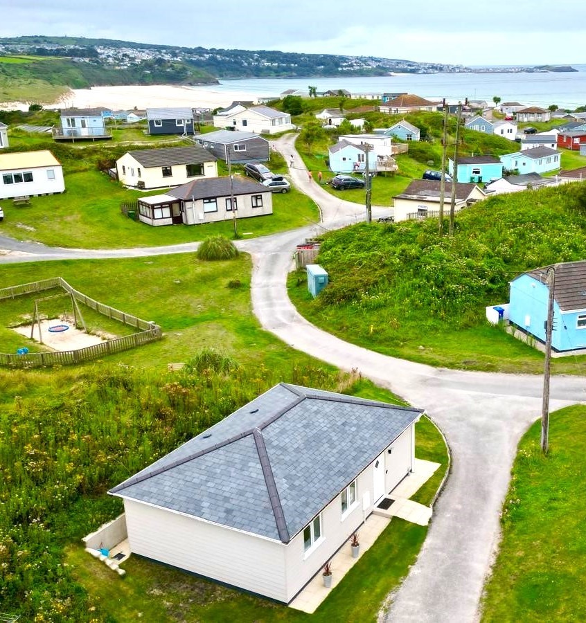 Built in 2023, Tweenbanx is nestled in the sand dunes on Rivere Towans, Hayle, situated in a quieter area of the park. It is one of a collection of privately owned beach chalets set in some 40 acres of sand dunes which have direct access to the Hayle Towans beach, overlooking St Ives.